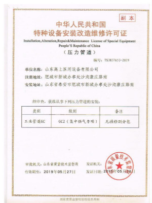 公司成立至今,經過全體職工不懈努力,各項事業正蓬勃發展,蒸蒸日上。先后獲批了《醫療器械經營許可證》、《醫療器械生產許可證》、《醫療器械產品注冊證》、《建筑企業資質證書》、《安全生產許可證》及《壓力管道安裝許可證》并順利通過了ISO9000質量體系認證??蛻裟壳氨椴既珖鄠€省、市、區并以優越的產品質量贏得了用戶的一致好評。
