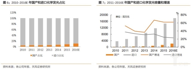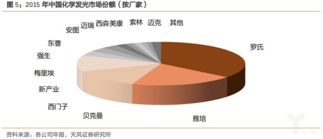 2015年化學(xué)發(fā)光中國市場容量約為160億元,目前中國常見的品牌約有15家,其中10家為進口企業(yè),占據(jù)90%的市場份額。