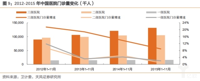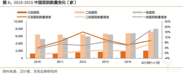 注:2015年醫(yī)院數(shù)量衛(wèi)計委只有1-11月數(shù)據(jù),但不影響整體趨勢和判斷。