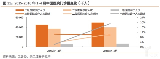 2016年1-4月一級醫(yī)院數(shù)量激增,同比2015年增長24%,而2015年同比增長9%。醫(yī)院數(shù)量不代表病人流向,但是作為標(biāo)桿數(shù)據(jù),可一定程度上表明政府的資金投入流向。而門診量則是分級診療成效的重要參考數(shù)據(jù)。