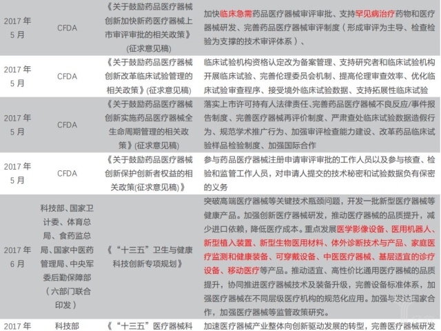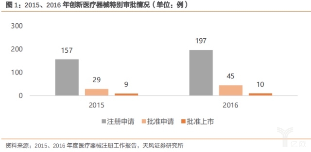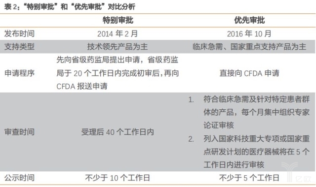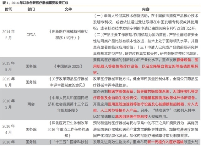 2014年2月,CFDA發(fā)布《創(chuàng)新醫(yī)療器械特別審批程序(試行)》,要求申請的醫(yī)療器械具備核心技術(shù)發(fā)明專利權(quán)、工作原理國內(nèi)、較同類產(chǎn)品的性能或安全性有根本性改進、技術(shù)處于國際領(lǐng)先水平、具有顯著臨床價值的成型產(chǎn)品。2016年10月,CFDA發(fā)布《醫(yī)療器械優(yōu)先審批程序》,對于治療罕見病、常見腫瘤、老年人特有和多發(fā)疾病、兒童和臨床急需的境內(nèi)第三類和進口第二類、第三類醫(yī)療器械注冊申請實施優(yōu)先審批。同時支持列入國家科技重大專項或國家重點研發(fā)計劃的醫(yī)療器械。