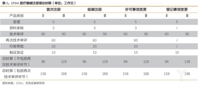 相比于傳統(tǒng)審批流程,特別審批程序的審批時限較為縮短,例如正電子發(fā)射及X射線計算機斷層成像裝置(明峰醫(yī)療公司)從確定進入特別審批通道到獲準(zhǔn)上市僅花了5個月的時間(以下圖表僅為理論時間,實際上常規(guī)流程Ⅱ類醫(yī)療器械審批需要2年左右的時間才能獲得注冊證,Ⅲ類需要3年左右),未來隨著經(jīng)驗積累和流程優(yōu)化,審批時間有望進一步縮短。