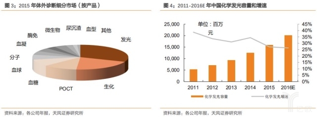 由上圖看出,從市場容量和行業(yè)增速兩個維度來看,化學(xué)發(fā)光細分具有良好的投資價值潛質(zhì)。2015年化學(xué)發(fā)光市場容量160億,占整個體外診斷行業(yè)30%以上,2015年行業(yè)增速27%,未來3-5年仍具備較高的行業(yè)景氣度。